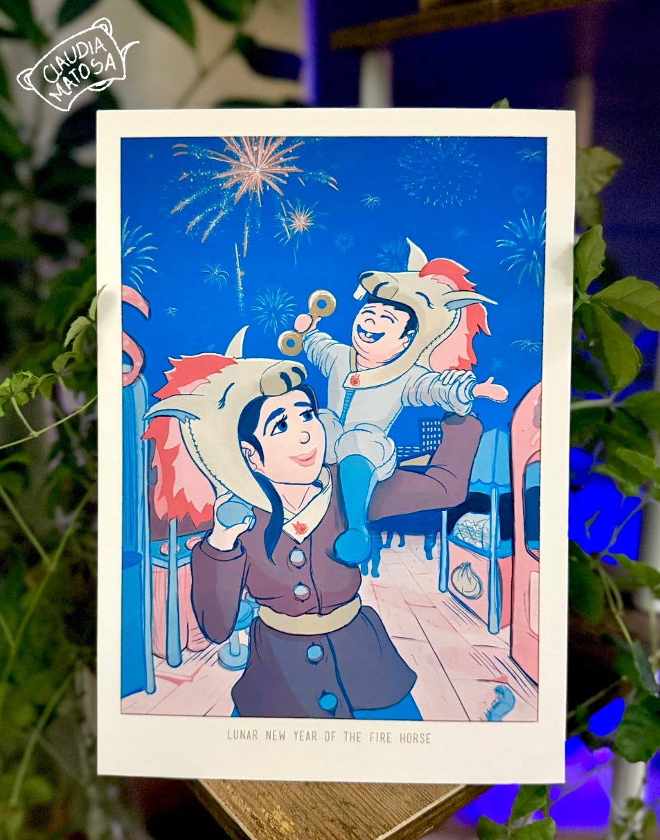 I wanted to paint something close to my heart, and was thinking about how much I’m looking forward to taking our little one to see fireworks. East Asian culture is a big part of my life in London, from friends to favourite foods and places where I hang out; I hope this silly drawing brings out how much I admire it.
